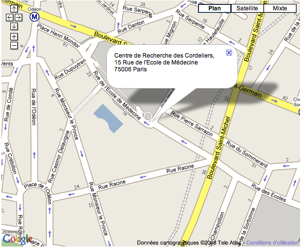 Cordeliers Research Center 15, rue de l'Ecole de Medecine 75006 PARIS-FRANCE Metro station Odeon